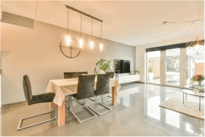 Para distribuir uniformemente a luz no ambiente, podem ser colocados plafonds com luz difusa. Os locais recuados são reabastecidos de forma mais direta e precisa em locais estratégicos. A mesa de jantar possui pendente com design moderno.