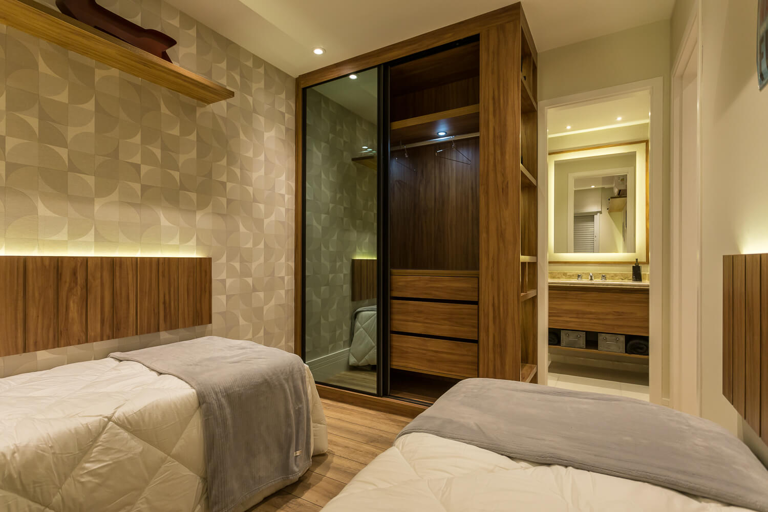 Além da praticidade que oferece, o acréscimo serve para aumentar a sensação de amplitude do quarto. Sem contar que a superfície espelhada promove um ganho de luz natural, o que otimiza a iluminação do ambiente.