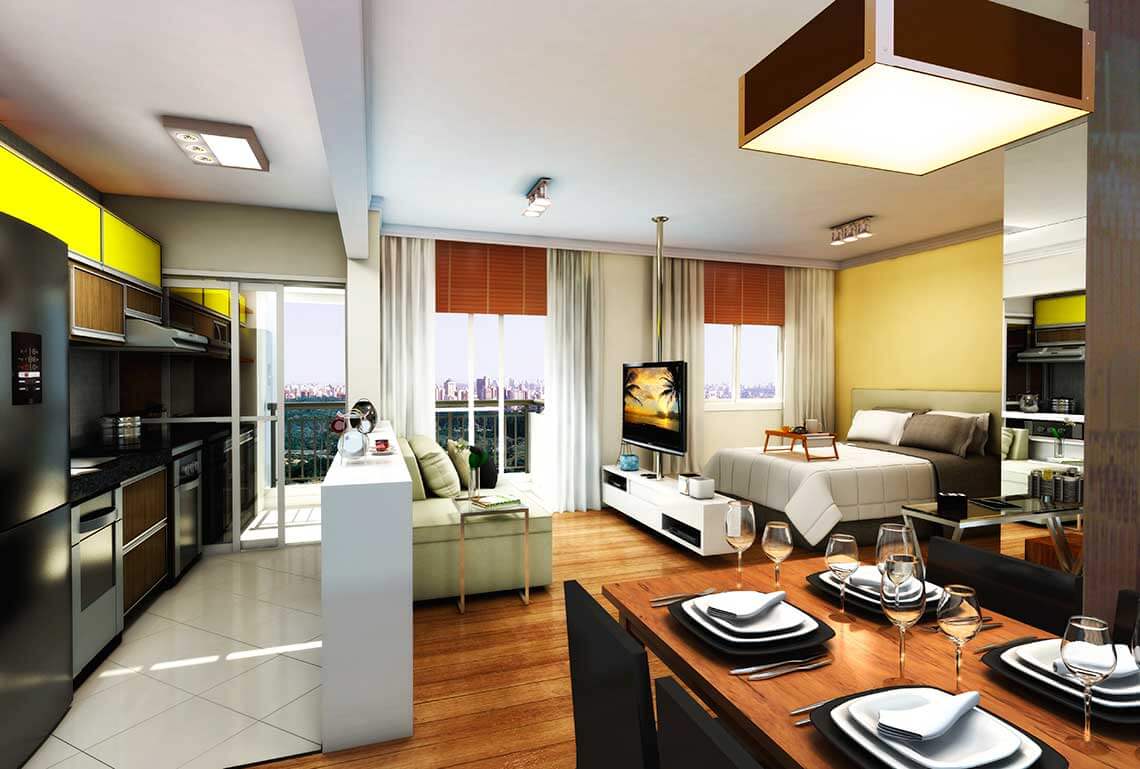Para solteiro, executivo, estudante ou casal, o apartamento é dinâmico e estiloso. Espelhos são conhecidos aliados na tarefa de dar amplitude ao apartamento. A fórmula, de tão usual em espaços pequenos, pode até parecer clichê.